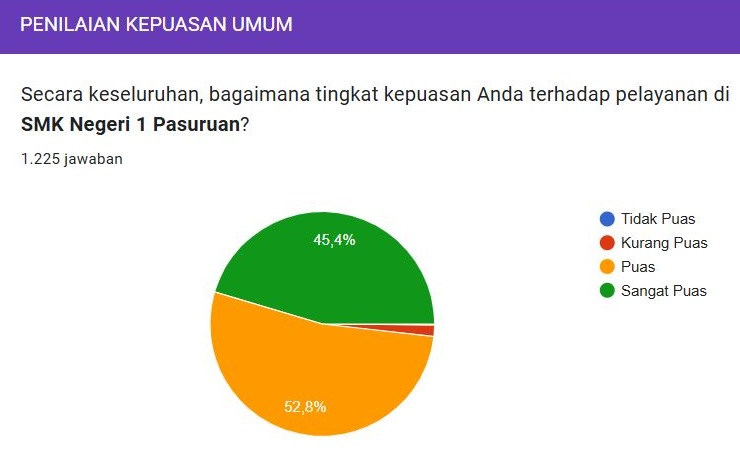 Berdasarkan hasil survei kepuasan masyarakat terhadap pelayanan di SMK Negeri 1 Pasuruan yang melibatkan 1.225 responden, diperoleh gambaran bahwa mayoritas responden merasa puas. Sebanyak 52,8% responden menyatakan “Puas”, sementara 45,4% responden memberikan penilaian “Sangat Puas”.
